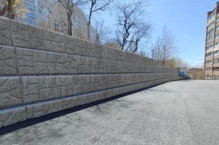 Подрядчик по муниципальному контракту демонтировал старую конструкцию и смонтировал стену из коробчатых блоков.
