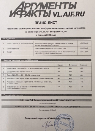 Газета «Аргументы и Факты-Приморье» - еженедельное общественно-политической печатное издание форматом А3. Выходит по средам. Общий объем - не менее 16 полос, с наличием цветности. Тираж газеты «Аргументы и Факты – Приморье» в 2026 году -6 500 экземпляров. Территория распространения - Приморский край.