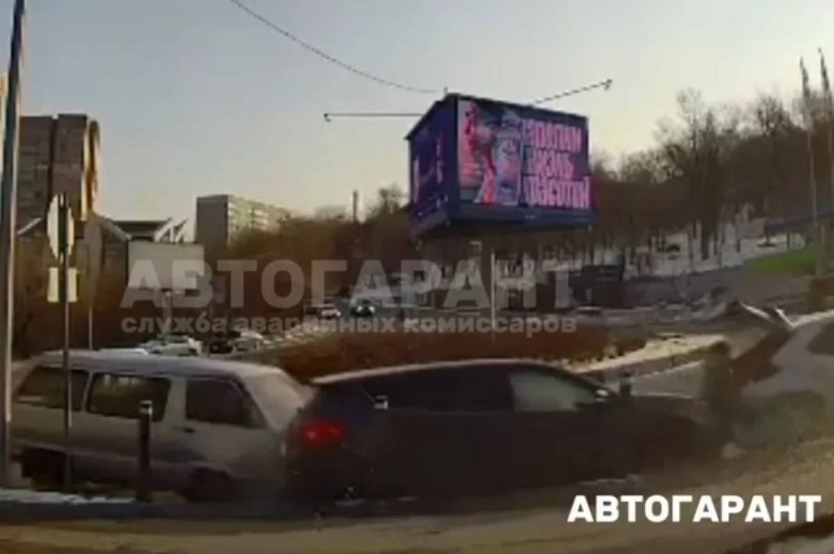 ДТП с участием трех автомобилей произошло на кольцевой развязке в районе дома 10а по улице Шилкинская во Владивостоке, пострадали люди.t